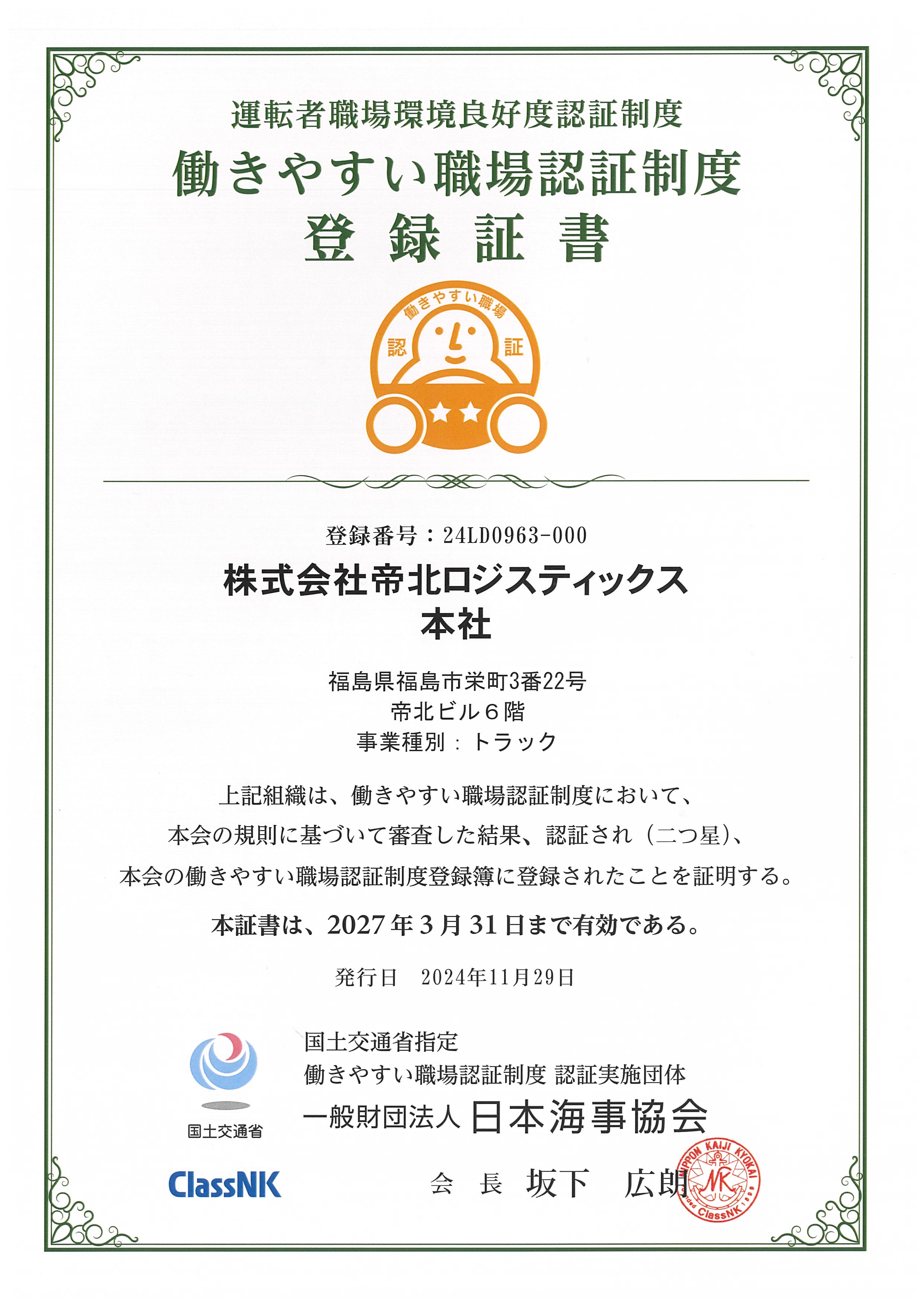 - 運送事業部が「運転者職場環境良好度認証(働きやすい職場認証)」に認証